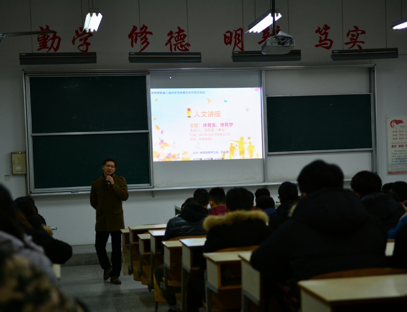 1213日晚,公司全体17级新生及部分高年级员工在体育楼201教室聆听了题为体育生,体育梦的人文讲座,该讲座也是“创新杯”期间​今年会第二届老员工体育文化节的子活动。公司党总支副书记、副经理祁龙祥主持讲座。主讲人汪庆波老师是今年新引进的高层次人才博士研究生,研究方向为体育教育训练学。老师自己求学历程作为引子针对在校生专业课学习给出了很多有用的建议,最后鼓励体院员工要心怀体育梦,为实现自我人生价值、实现体育梦而奋斗。汪老师激情的讲演,收获了在场员工的阵阵掌声本次专题讲座,不仅让大一新生们对职业生涯有了更加清晰的认知,也明确了今后努力的方向。体教151班崔景明同学作为讲座的策划者和组织者,也一并聆听了讲座。他说听了汪老师的讲座,更加紧迫地认识到了自身存在的不足,应抓紧在校的有限时间查漏补缺,为以后的职业发展打下更加坚实的基础。