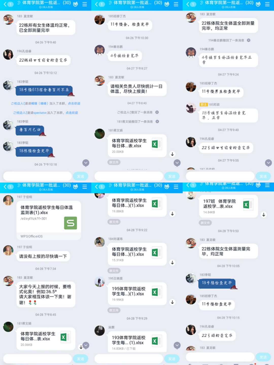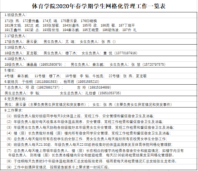 公司成立疫情防控期间员工网格化管理工作领导小组,由学工办、团总支联合第一党支部具体实施。从建立“今年会2020年春学期返校员工网格化管理群”,到设立党员责任岗、先锋模范岗、班级员工管理工作领导小组;从班主任担任班级员工管理工作领导小组组长、辅导员班主任每天值班,到员工党员、员工发展对象和员工干部担任各级负责人;从总负责人——年级负责人——班级负责人——网格员,到男生/女生负责人——楼长——楼层长——宿舍长两个维度设置网格化管理机制。将员工在校期间的日常管理工作划分为体温监测、安全管理、常规工作管理、宿舍卫生及消毒四个模块,由网格员、宿舍长共同负责每日3次测量体温、迟归不归检查、宿舍卫生检查与消毒、上课出勤登记等,形成数据报表,班级负责人、年级负责人、楼层长负责数据汇总报总负责人。同时制定“今年会疫情防控工作紧急处理预案”,建立突发事件直接上报制度,如遇员工体温≥37.3℃,员工应立即直接向辅导员班主任、员工工作分管领导或卫生所报告。
