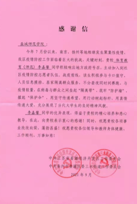 信中对公司21(3)班的李嘉馨同学积极主动加入疫情防控志愿者队伍、为当地疫情防控工作做出的无私奉献提出表扬,并对公司立德树人、人才培养方面所作的努力表示感谢。