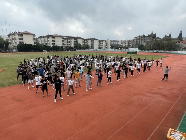 早上8点半,由2019、2020两个年级的7个社体专业的200名同学组成的跆拳道拳舞表演队伍,整齐划一地集结在田径场,年轻人身上散发的朝气迅速冲散了秋晨的凉意。