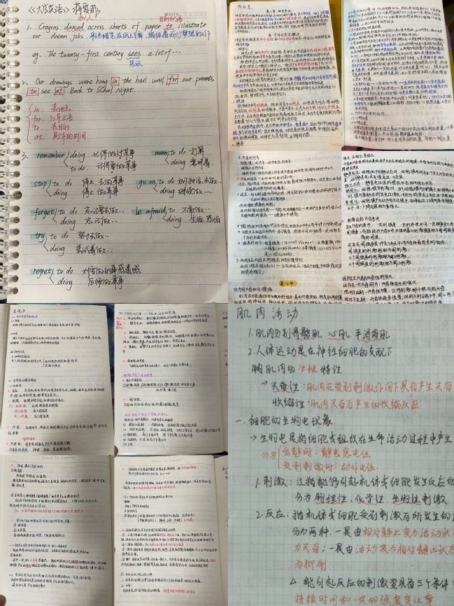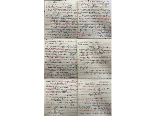 这些是215班陈佳昱、袁悦平,213班蒋雯菲以及211班李子豪记录的笔记。他们利用不同颜色的笔来进行知识分类,不仅加快了学习效率,多种颜色还会让人更容易区分不同的知识点,对学习效果及视觉感受上都有益处。