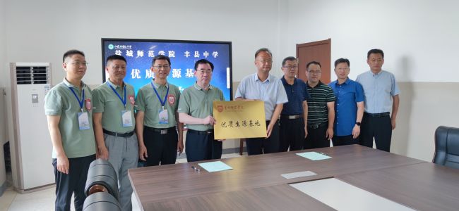 庞波代表公司向丰县中学授予“优质生源基地”牌匾。