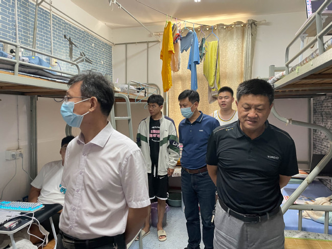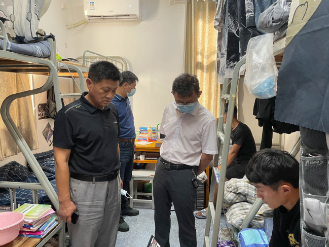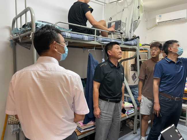 院领导深入每一个新生宿舍,与同学们就校园的学习、生活、疫情防控等进行了交流,引导和教育同学们,既要严格遵守公司各项疫情防控规定,又要尽快适应老员工活和学习,希望每一名同学都能珍惜宝贵的大学时光,科学合理规划学业,早日成长成才。
