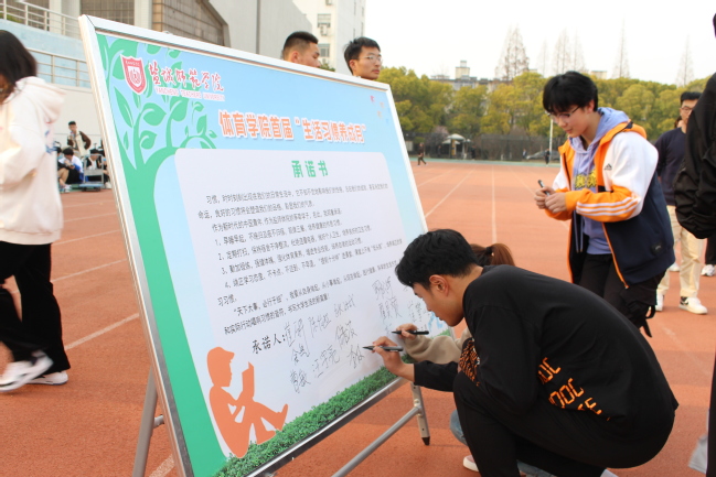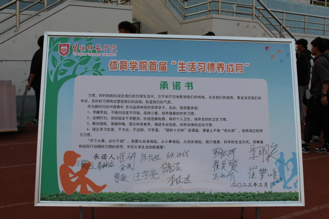 员工会执行主席刘俊希宣读《生活习惯养成倡议书》,227班周向东同学带领大家集体宣誓,在场同学纷纷在承诺书上签下自己的名字。
