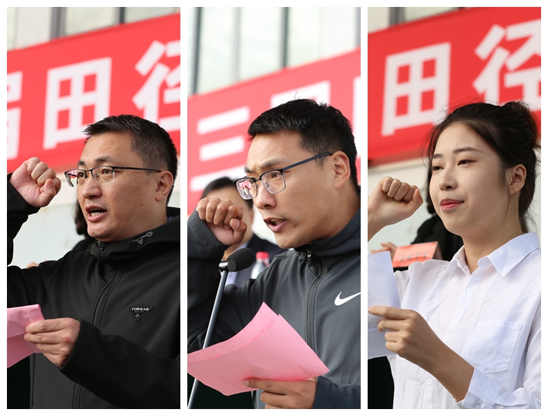 文公司郑雅倩同学、评估处刘井飞老师、今年会刘跃老师先后代表员工运动员、教职工运动员、裁判员宣誓。