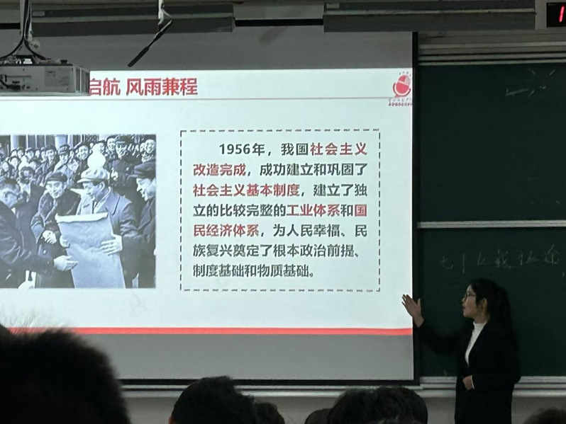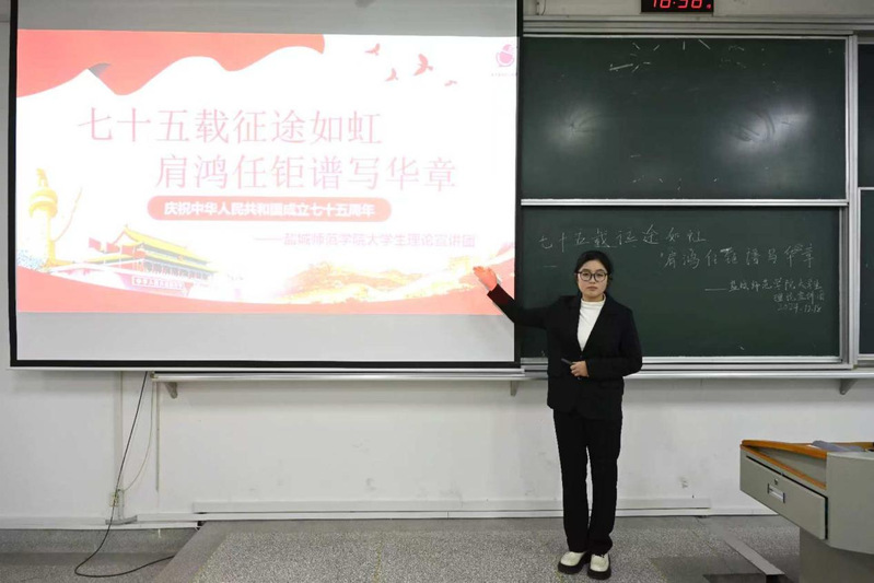 宣讲依序展开精彩篇章。开篇“岁月峥嵘,栉风沐雨”,宣讲团成员以一段震撼视频拉开回溯大幕,引领同学们回首七十五载奋进征程,中国人民实现了从站起来、富起来到强起来的伟大飞跃。继而到了“盛世风华,繁荣盛景”环节,通过援引详实事例与精准数据,全方位展现这七十五载辉煌成就。从重大科技项目的攻坚突破,到民生领域的持续改善;从教学科研的累累硕果,到文化传承创新的熠熠生辉,无数开拓者以无畏勇气跨越艰难,绘就时代绚丽篇章。宣讲团成员还巧妙融合生动讲述与多媒体展示,不仅带听众重温往昔峥嵘,更在“同心筑梦,凯歌前行”部分放眼未来,鼓舞同学们继承优良传统,勇担新时代重任,为国家发展献智出力。同时寄语同学们珍惜韶华、勤勉奋进,为中华民族伟大复兴注入青春力量。